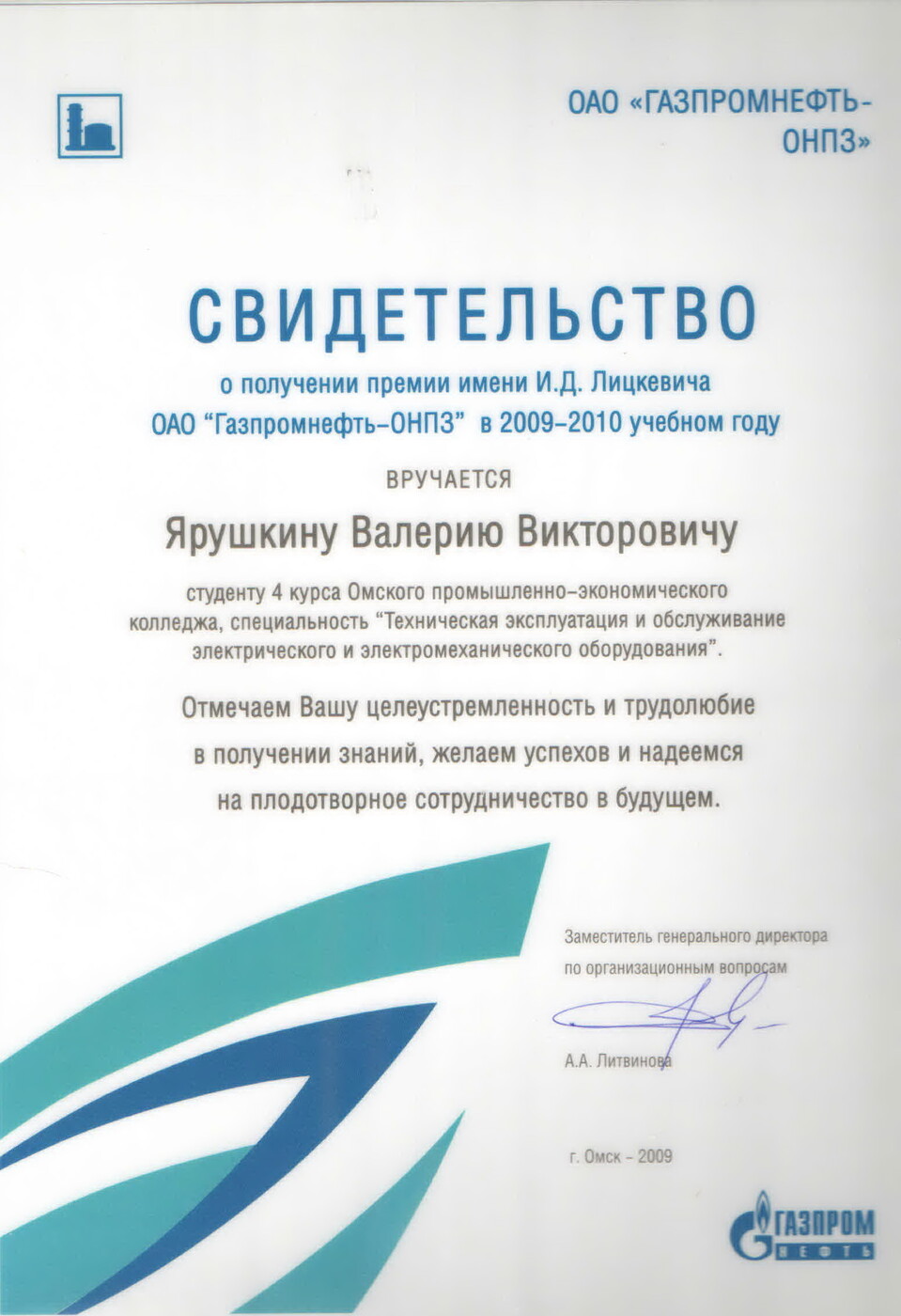 -в 2009 г. получил премию имени И.Д. Лицкевича ОАО "Газпромнефть-ОНПЗ" за целеустремленность и трудолюбие в получении знаний;